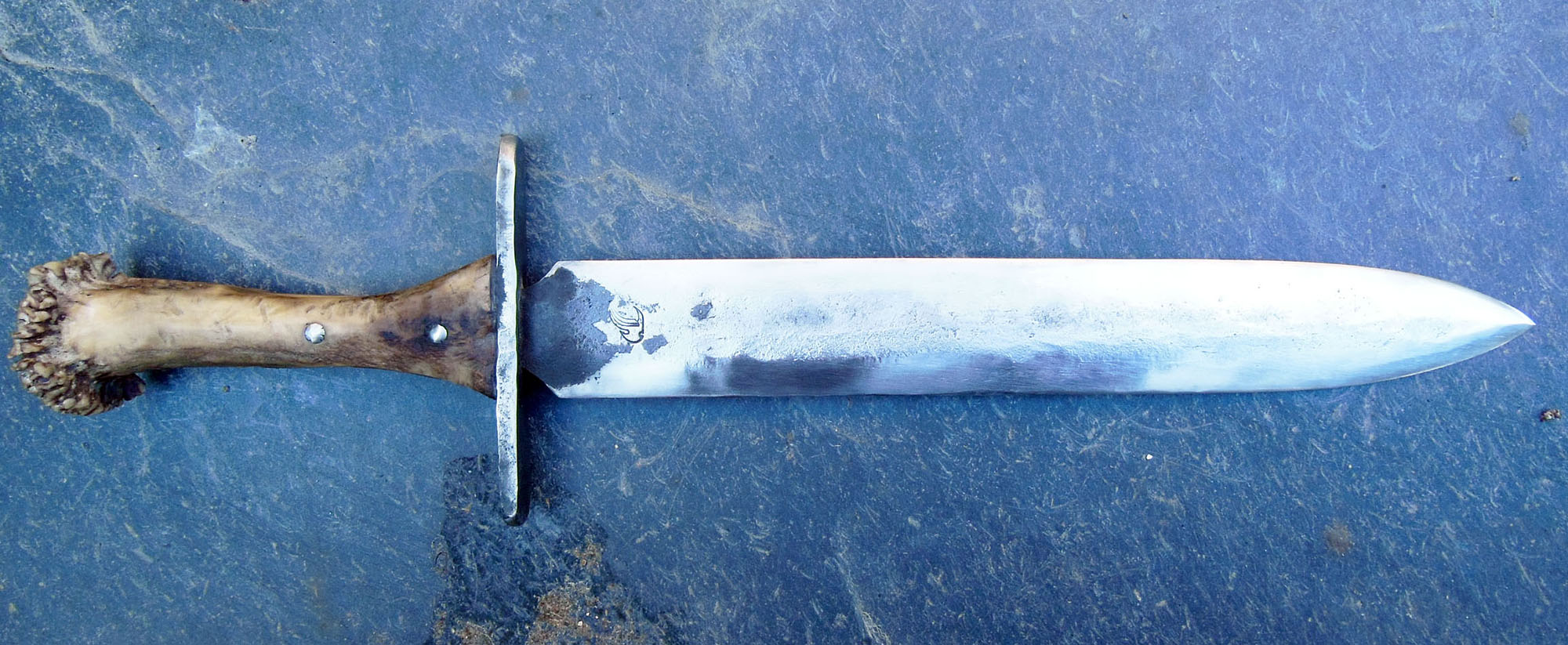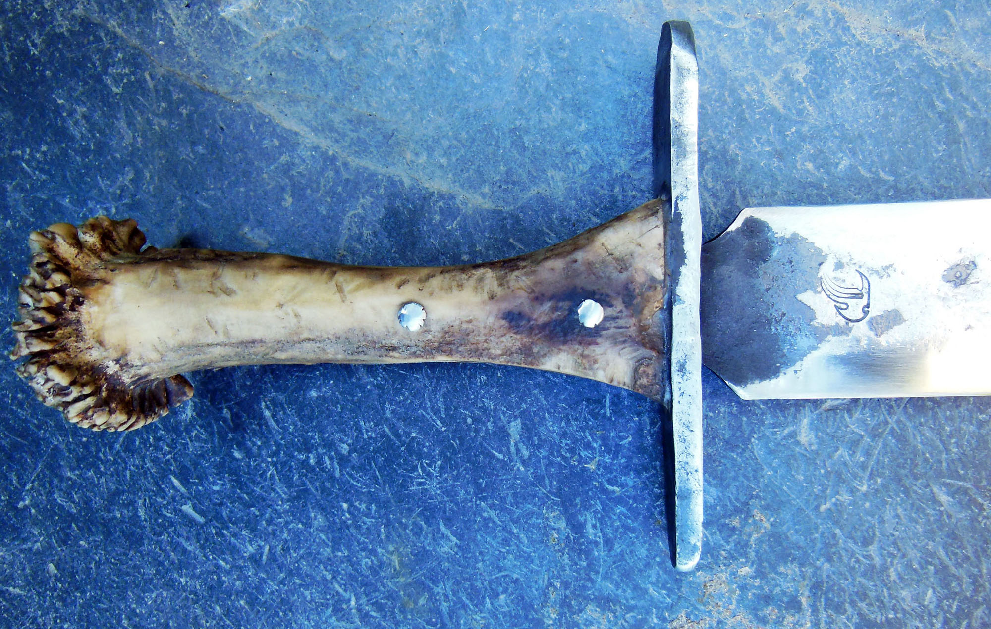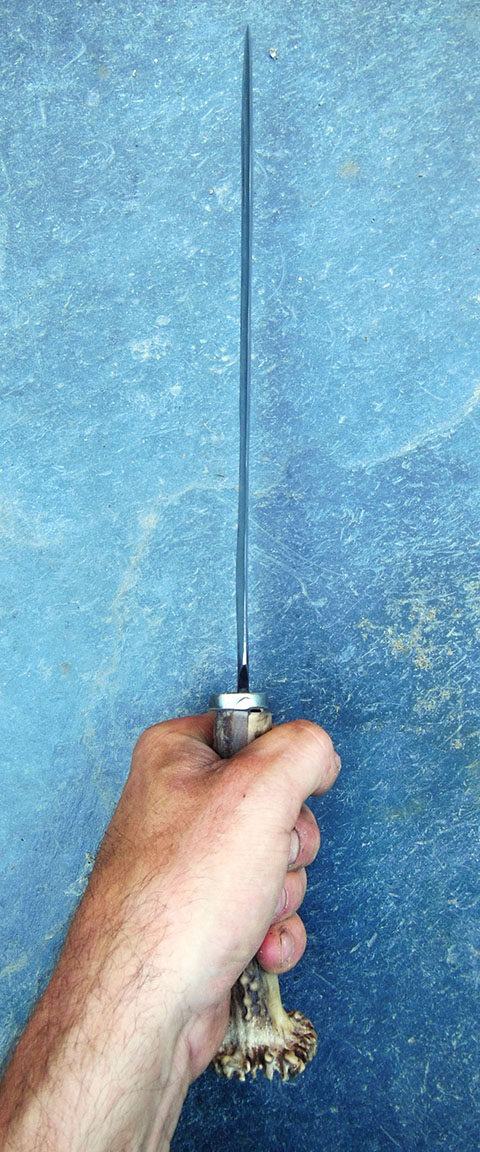 Manche en bois de cerf - longueur totale 35cm - Acier XC80 - Epaisseur env 3.5mm au centre - Rivets aciers - Finition Brut.