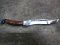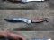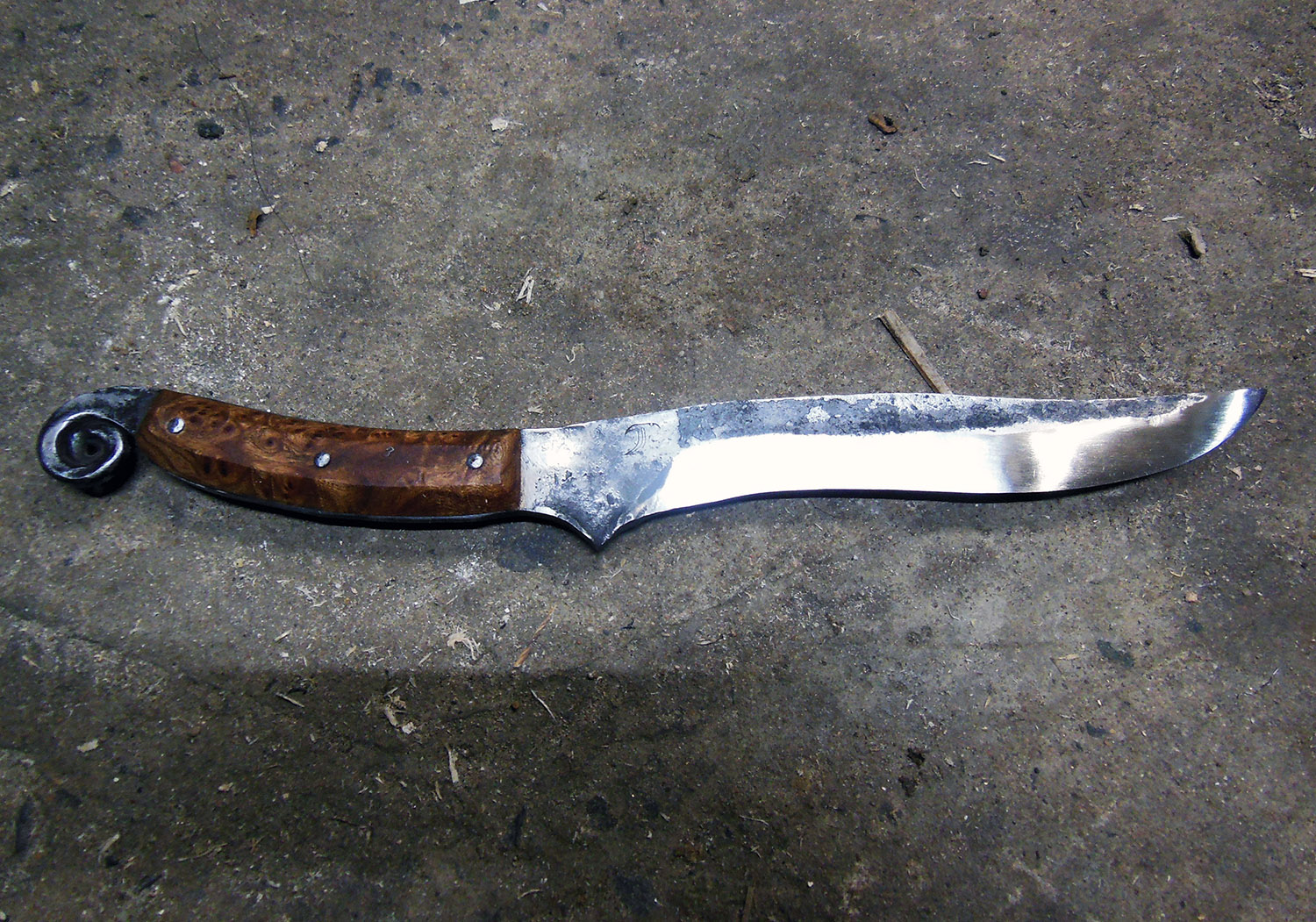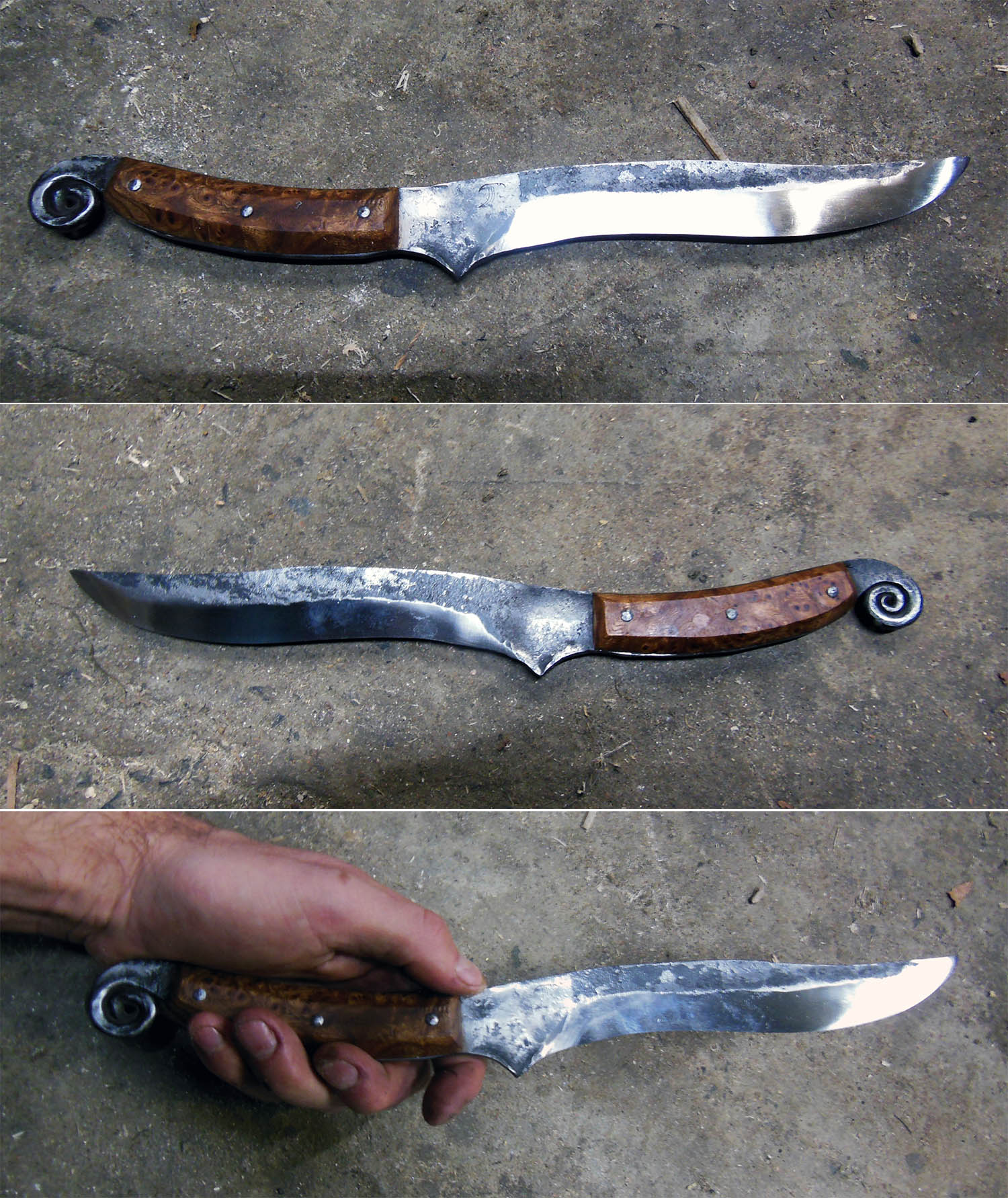 Longueur totale environ 35cm - Acier XC90 - manche en loupe d'orme - rivets acier Epaisseur env 4mm au dos.