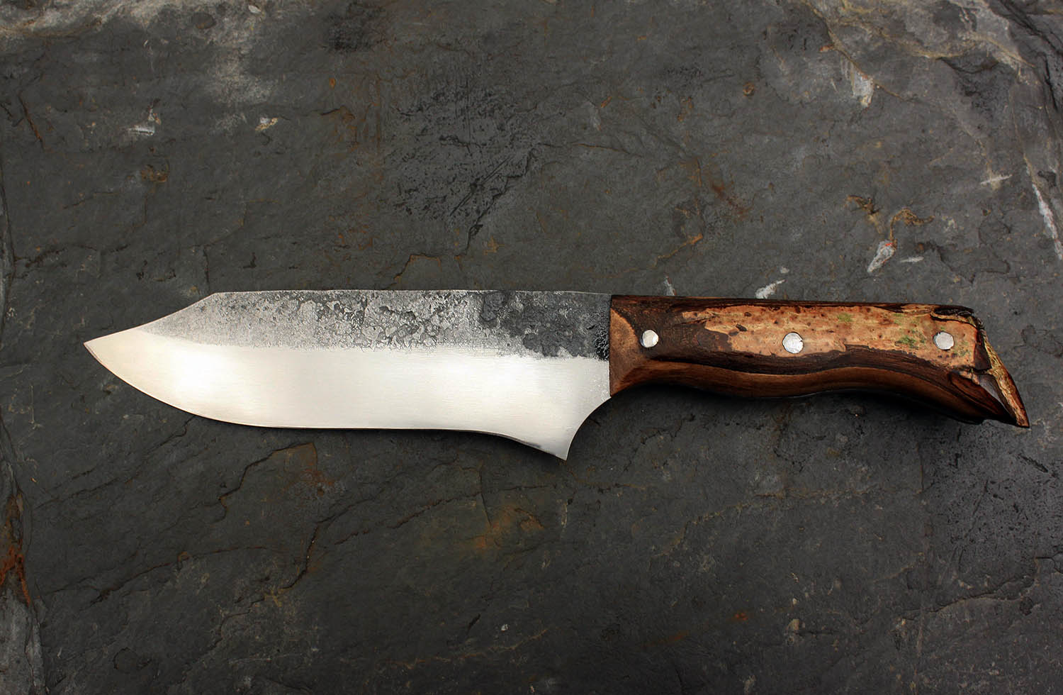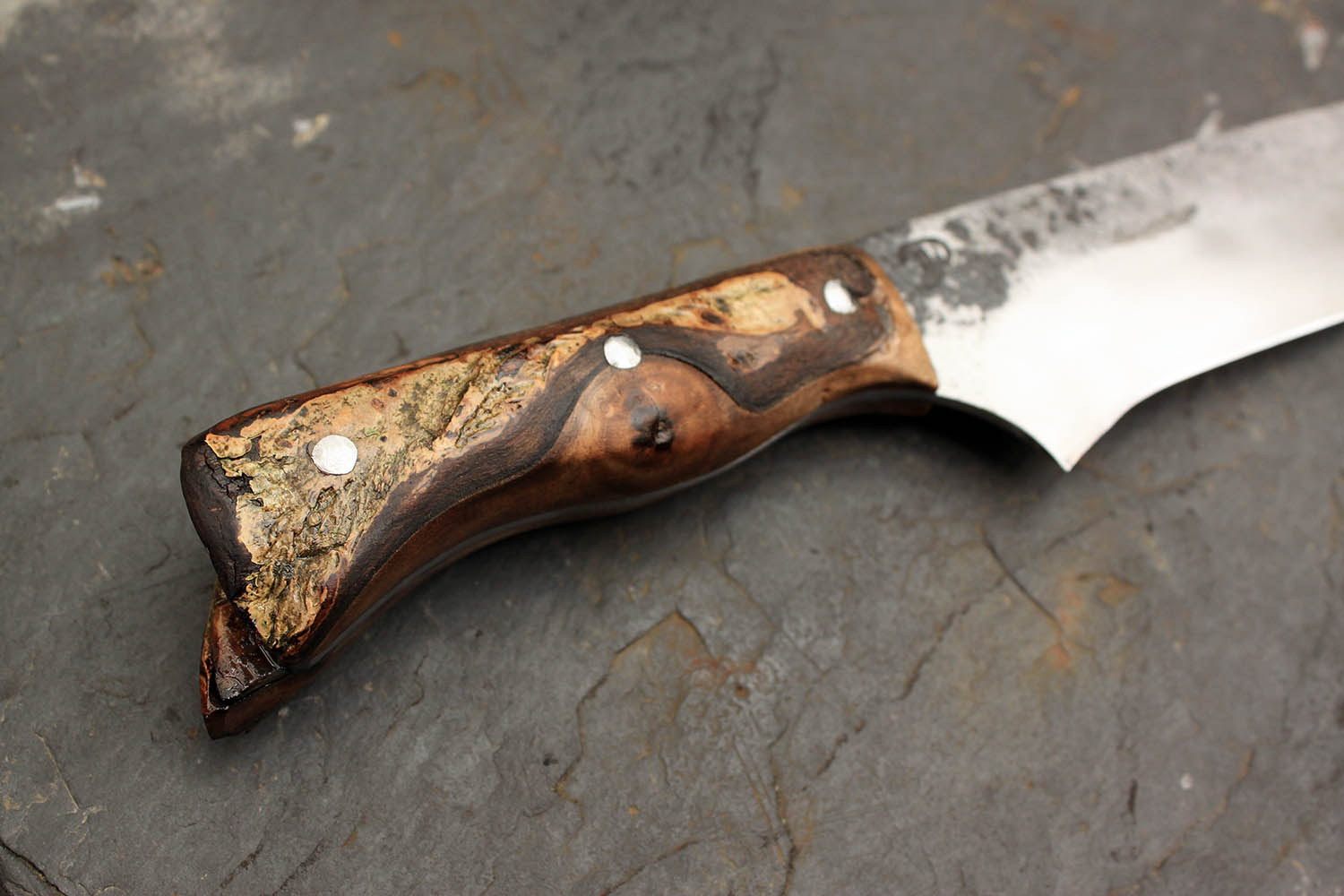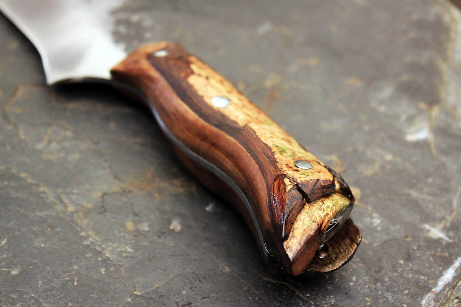 Réalisé pour la chaine de cuisine CHEFCLUB, ce couteau de 5cm de haut en acier XC100 est redoutable. Manche en châtaigner, rivet inox. Design souhaité par le client. Visible en action ici : https://it.pinterest.com/pin/762937993139652501/