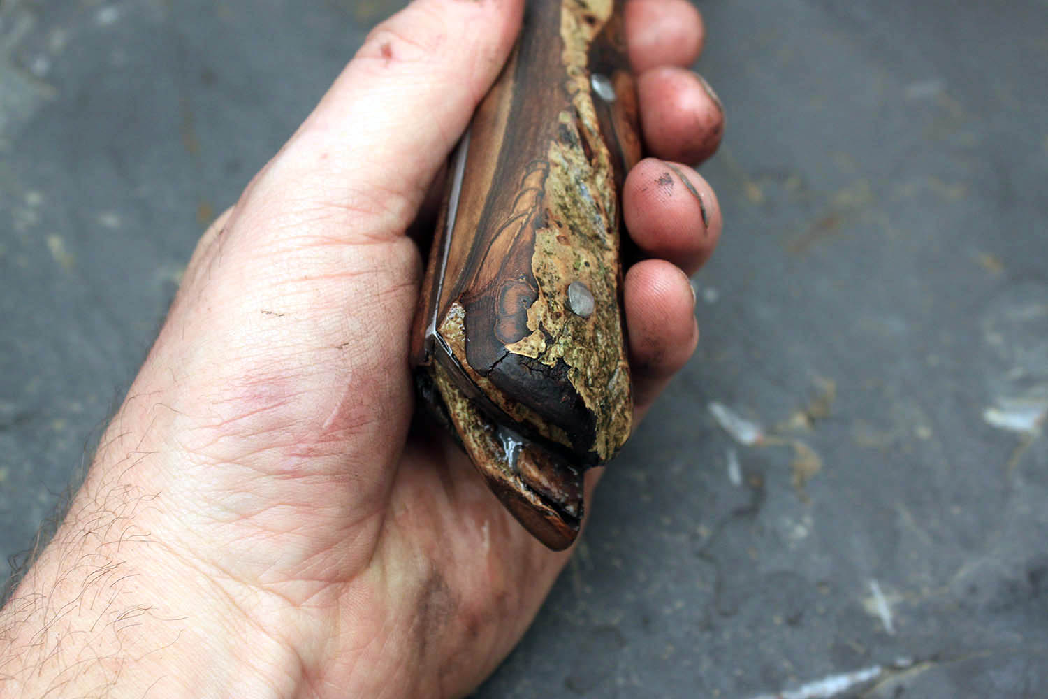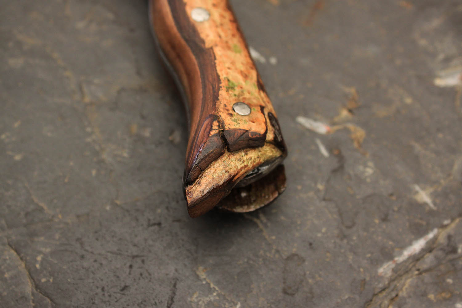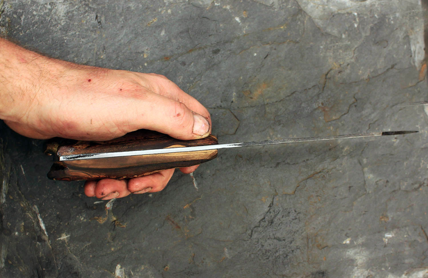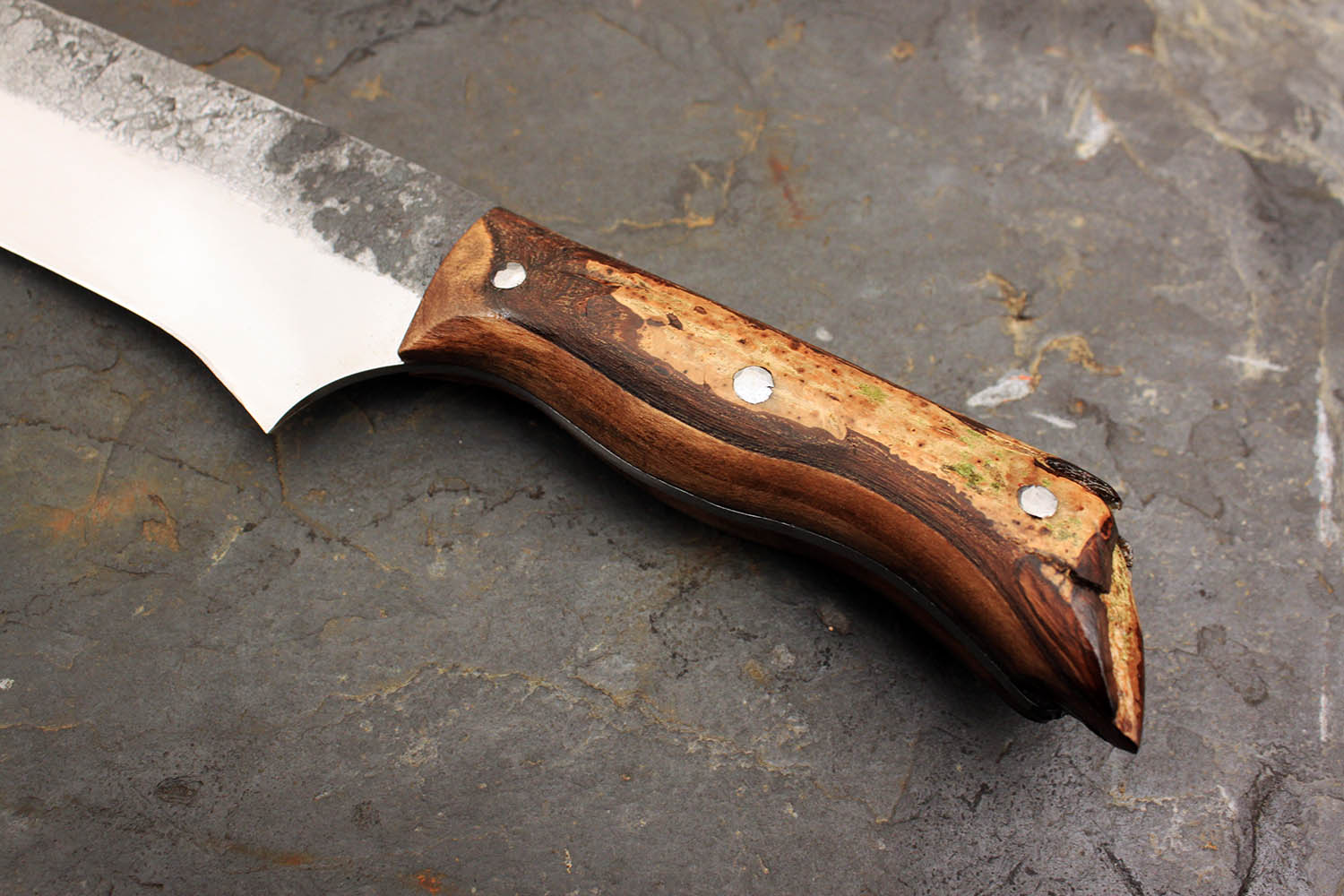 Réalisé pour la chaine de cuisine CHEFCLUB, ce couteau de 5cm de haut en acier XC100 est redoutable. Manche en châtaigner, rivet inox. Design souhaité par le client. Visible en action ici : https://it.pinterest.com/pin/762937993139652501/