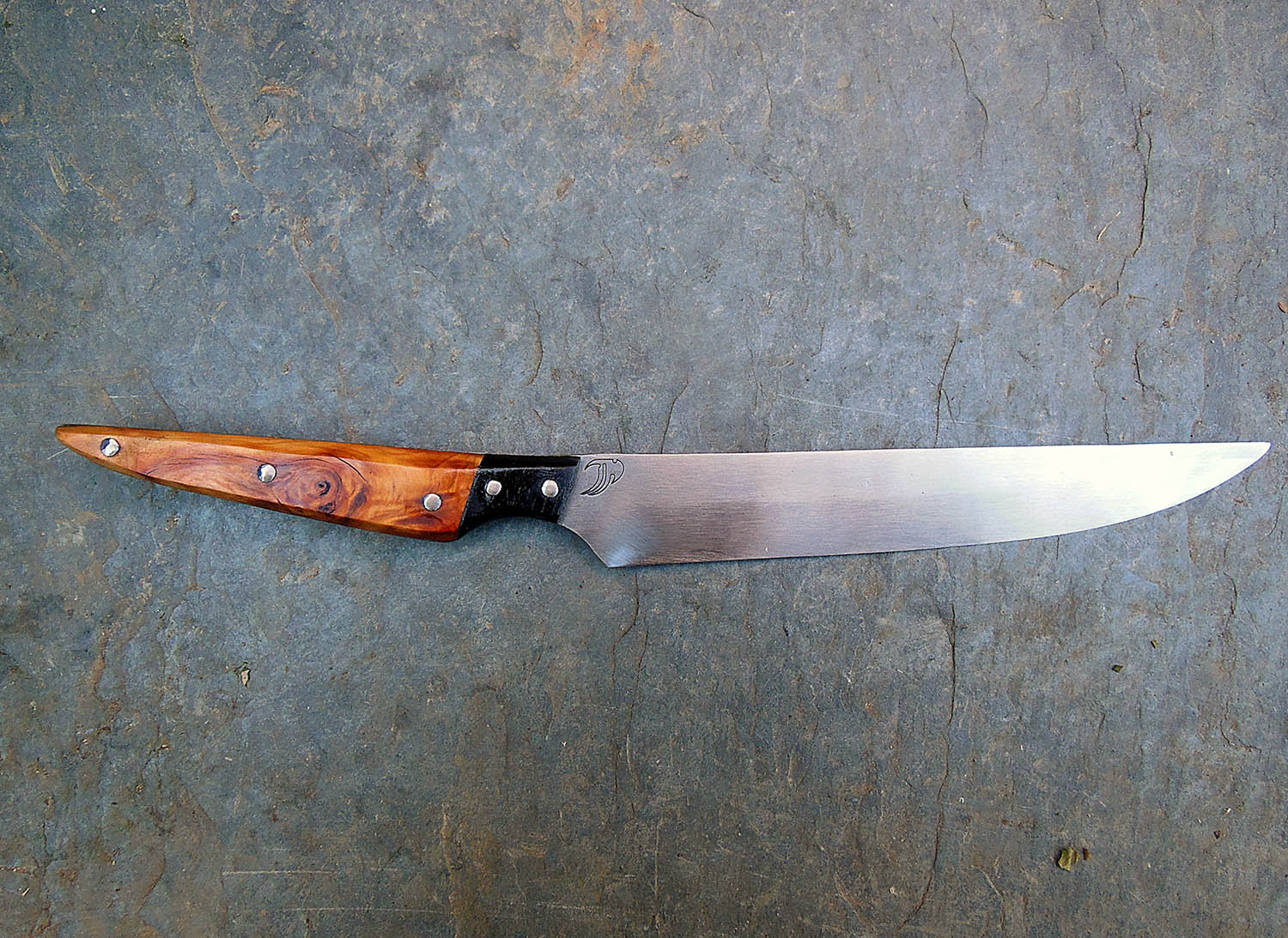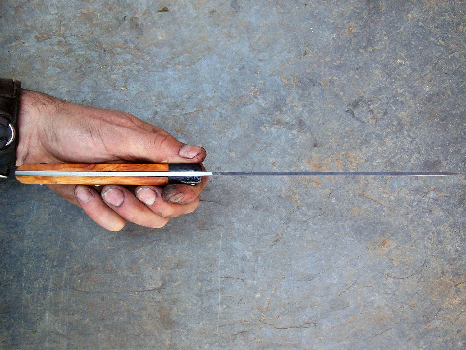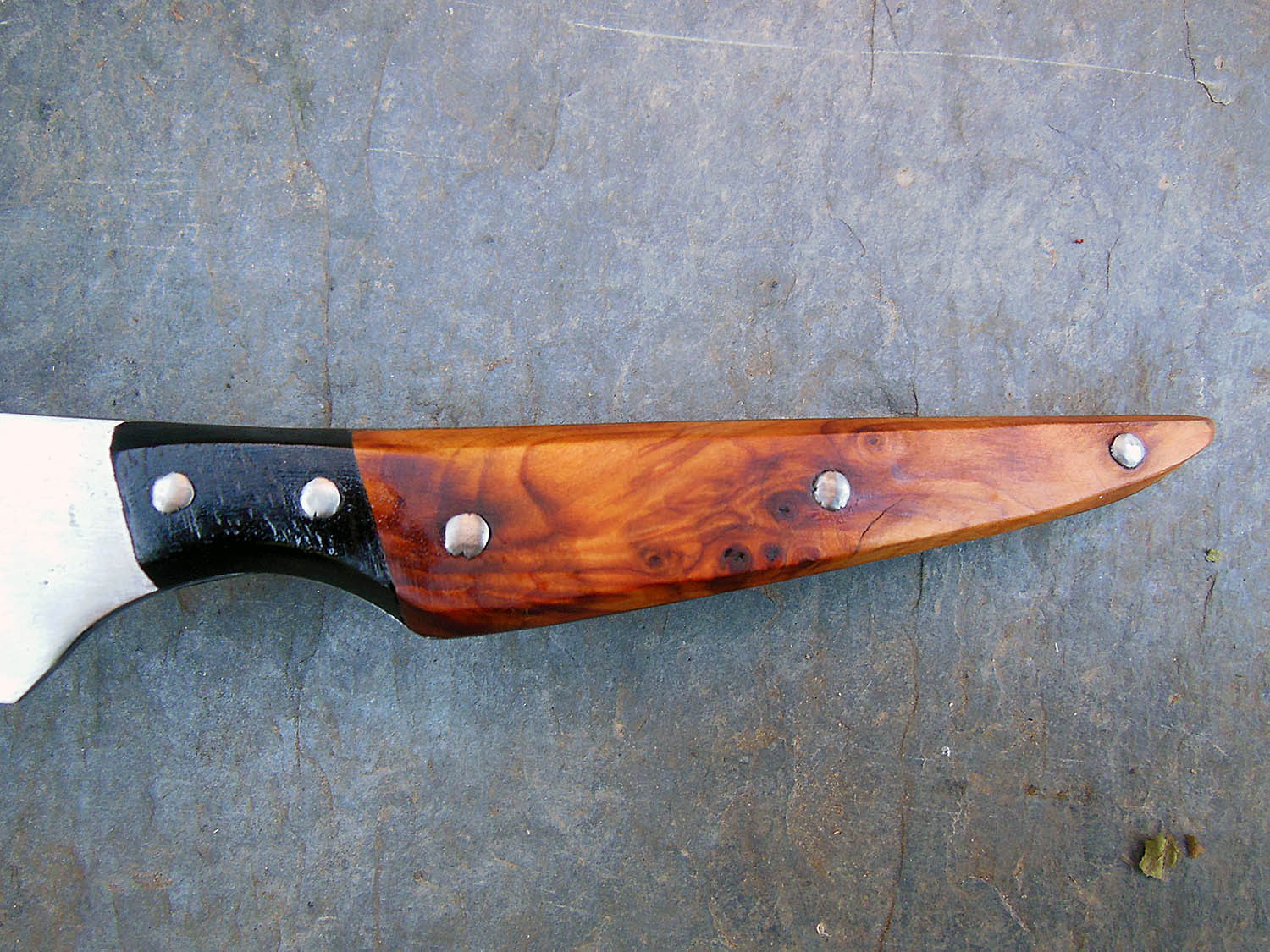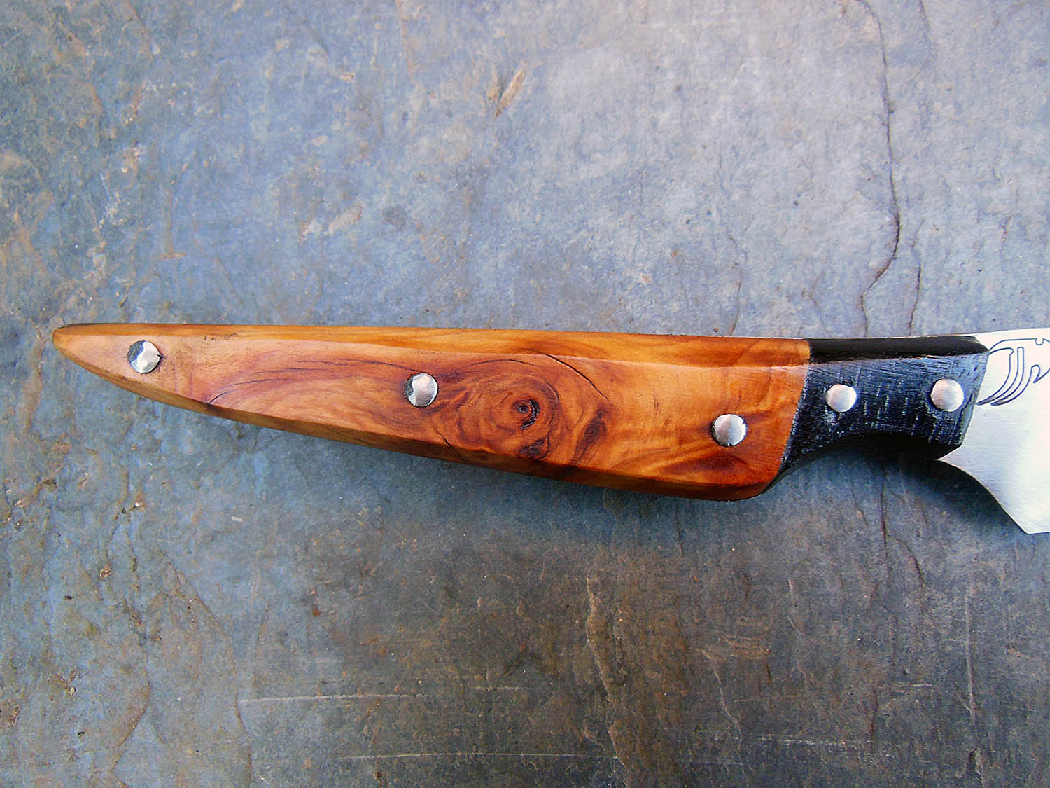 Manche de 13cm en duo d'if et d'ébène - lame de 16.5cm forgée en acier XC80 - Epaisseur env 3mm - Rivets aciers.