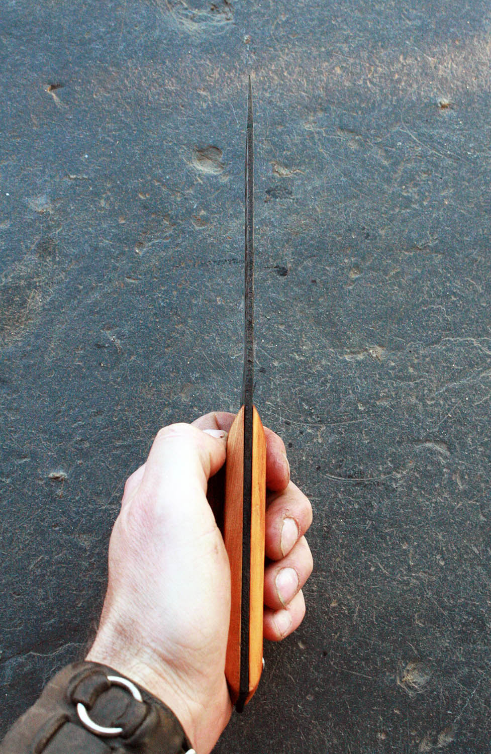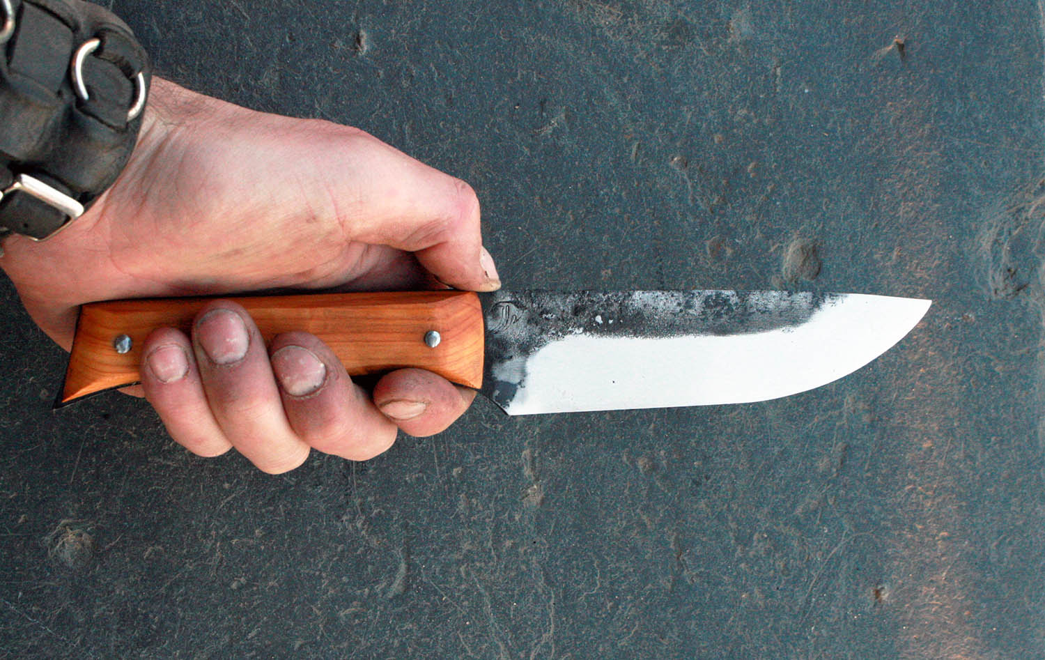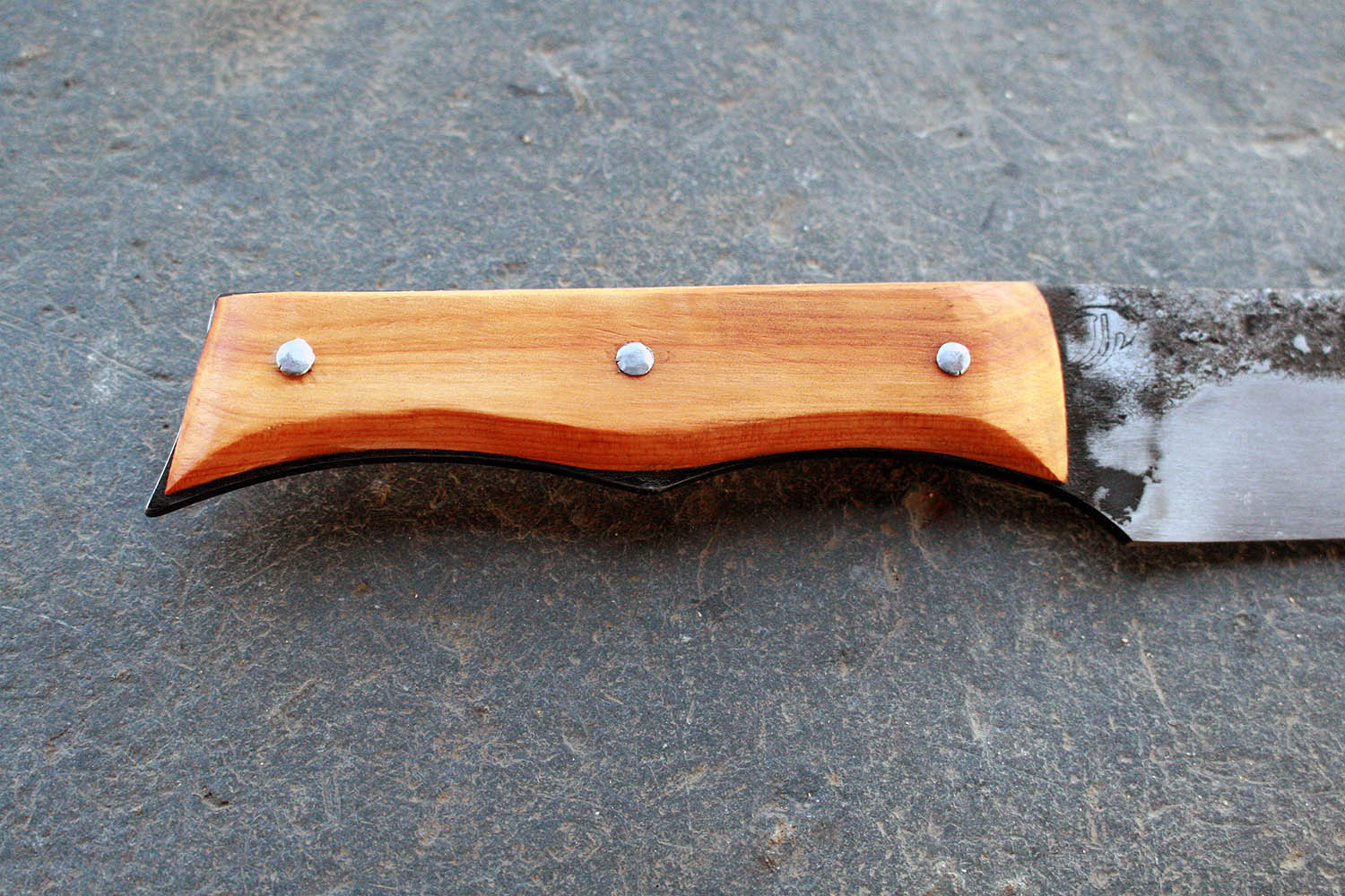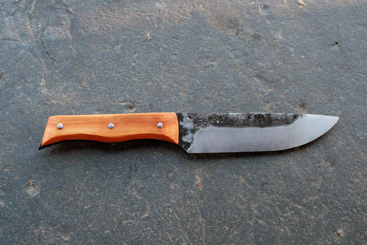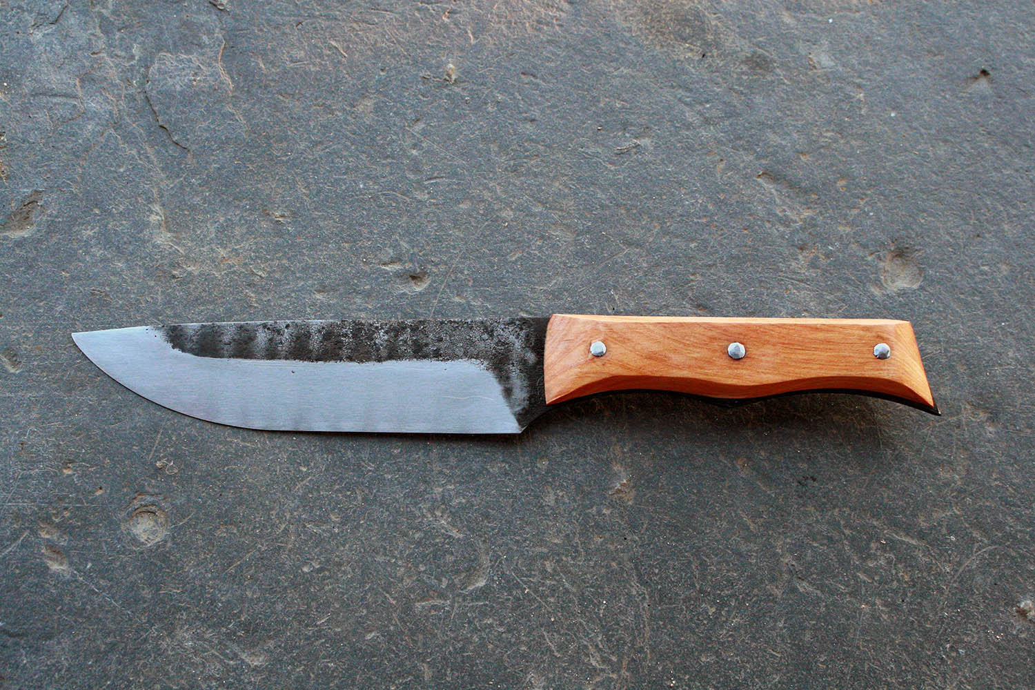 Manche en Cade de 12.5cm - Lame de 15cm forgée en acier XC80 - Hauteur de 3.5cm - Rivets aciers. Note : La partie acier du manche dépasse très légèrement du bois pour assurer une prise en main bien solide.