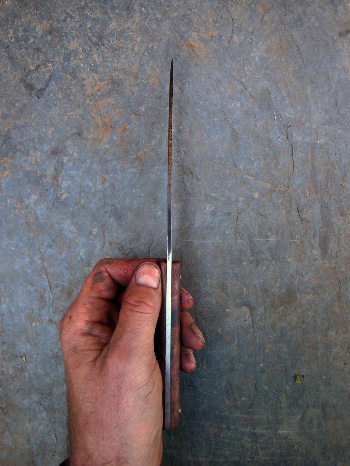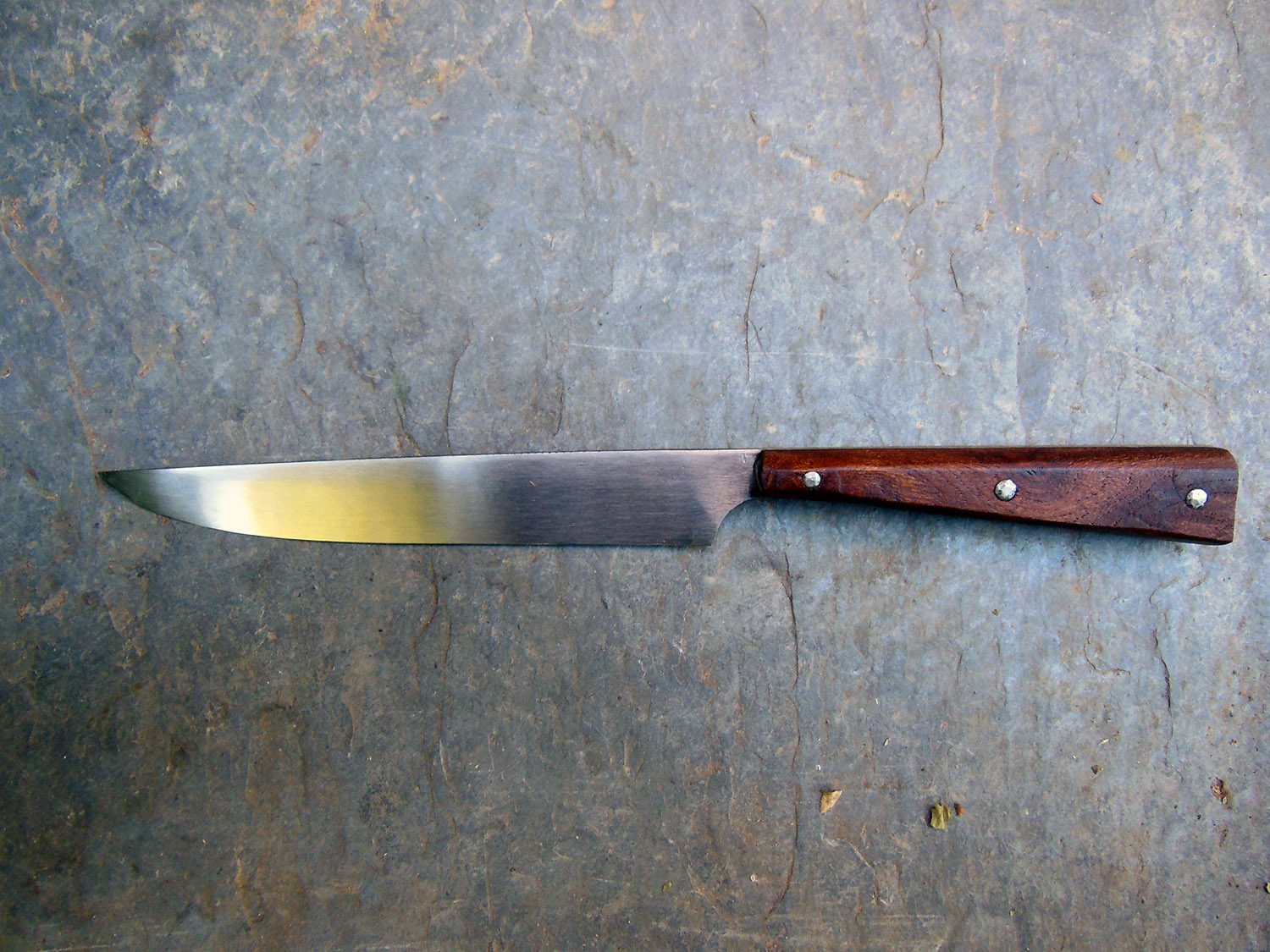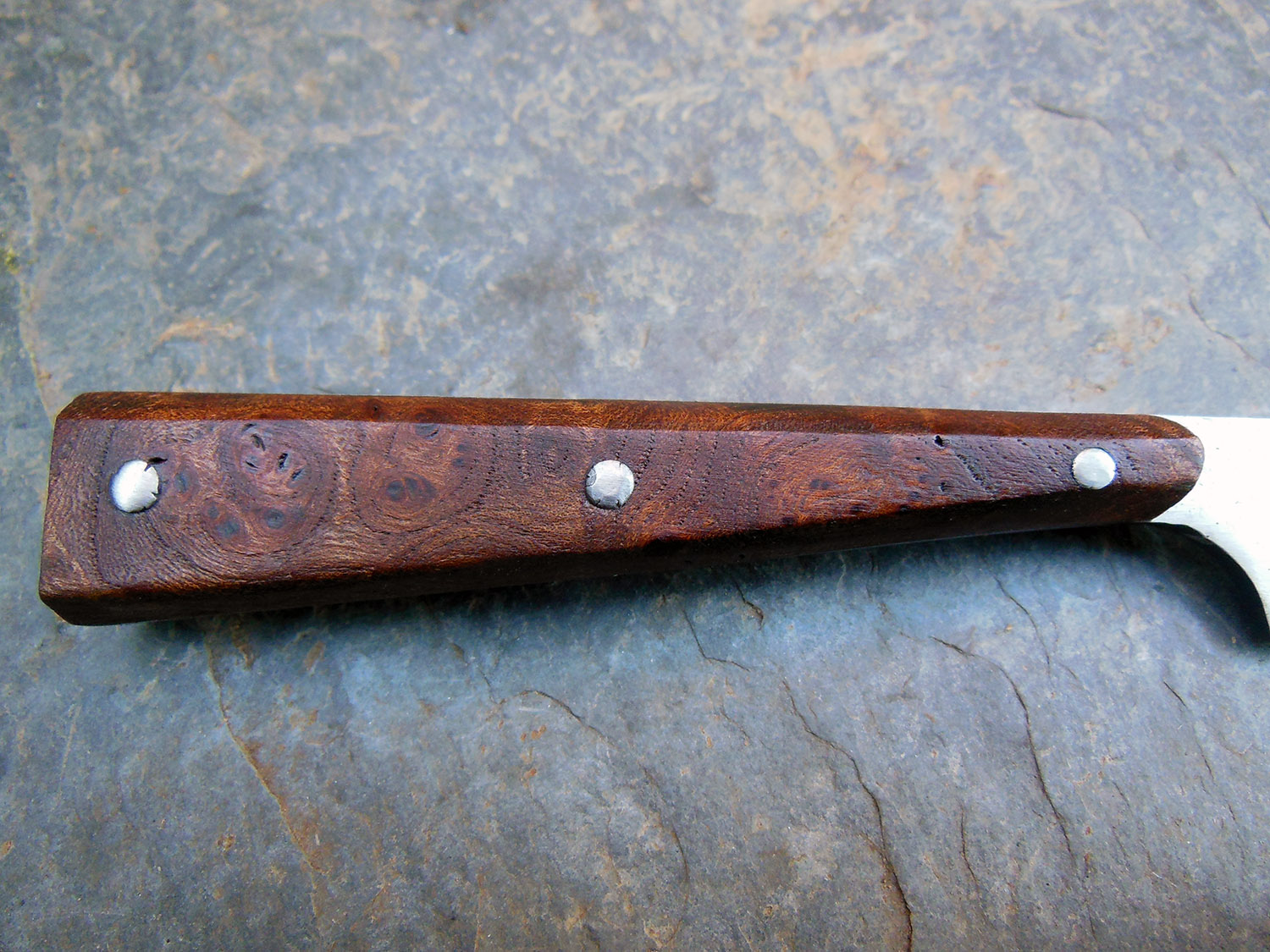 Manche en loupe d'orme (rare) 13.5cm - lame de 16cm forgée en acier XC90 - Epaisseur env 3mm - Rivets aciers.