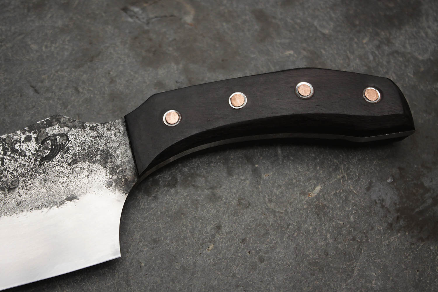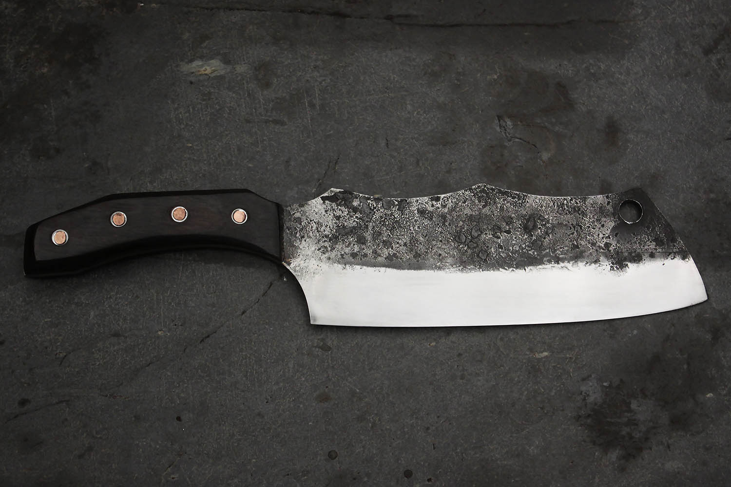 Très gros hachoir forgé avec lame de 18cm, manche de 14cm, hauteur de 7cm. Manche en ébène monté avec rivets cuivre sur rondelles inox. Acier XC100