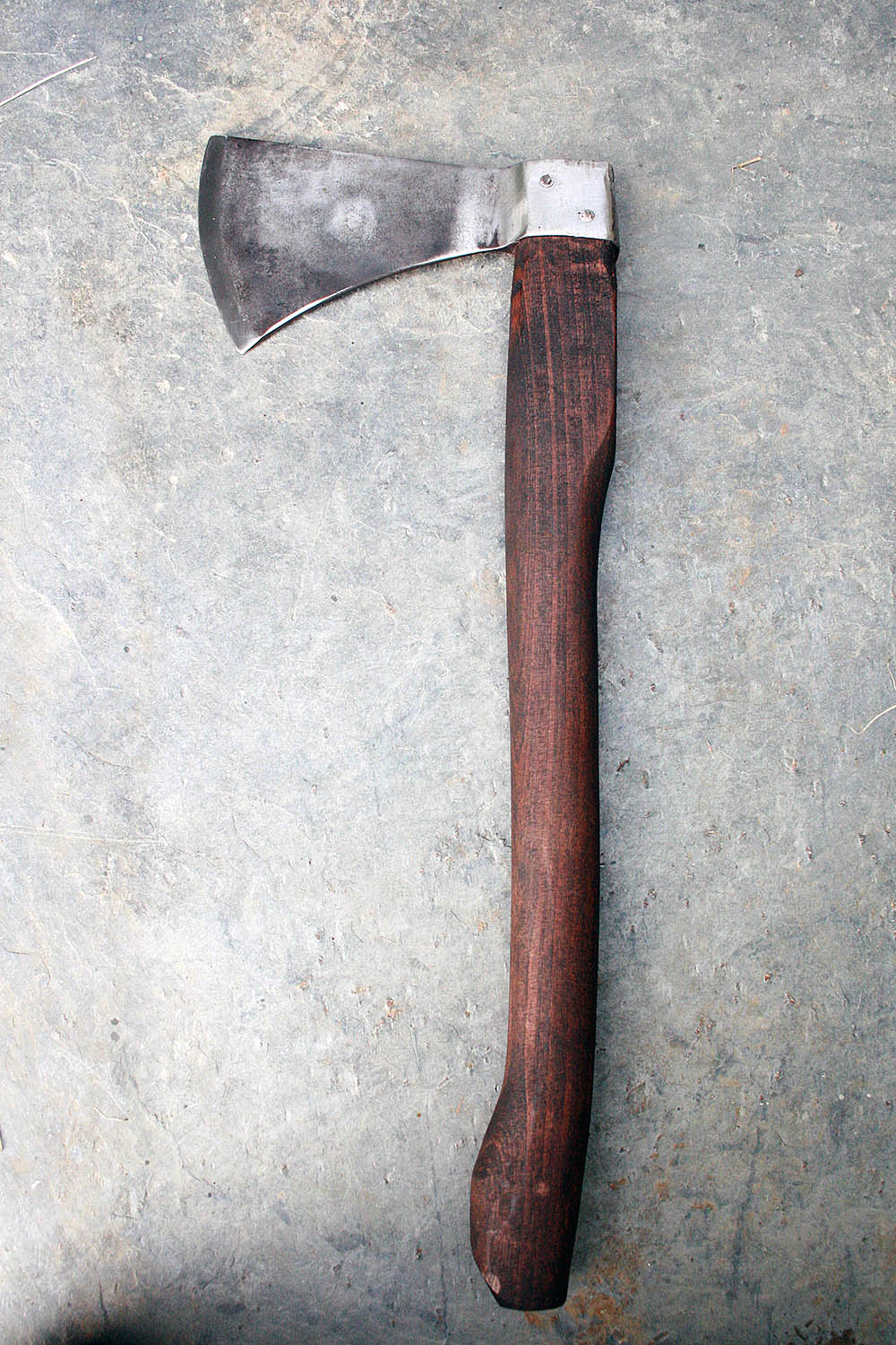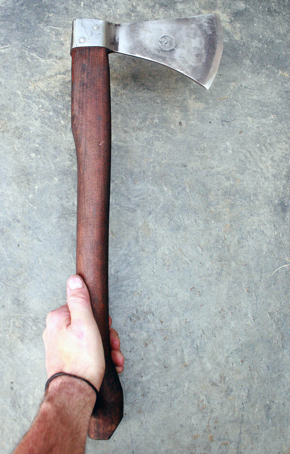 Hache de lancer en 54SiCr6 (acier à ressort) - 16cm de long - 8cm de tranchant - manche en fêne de 45cm. Poids : 826g