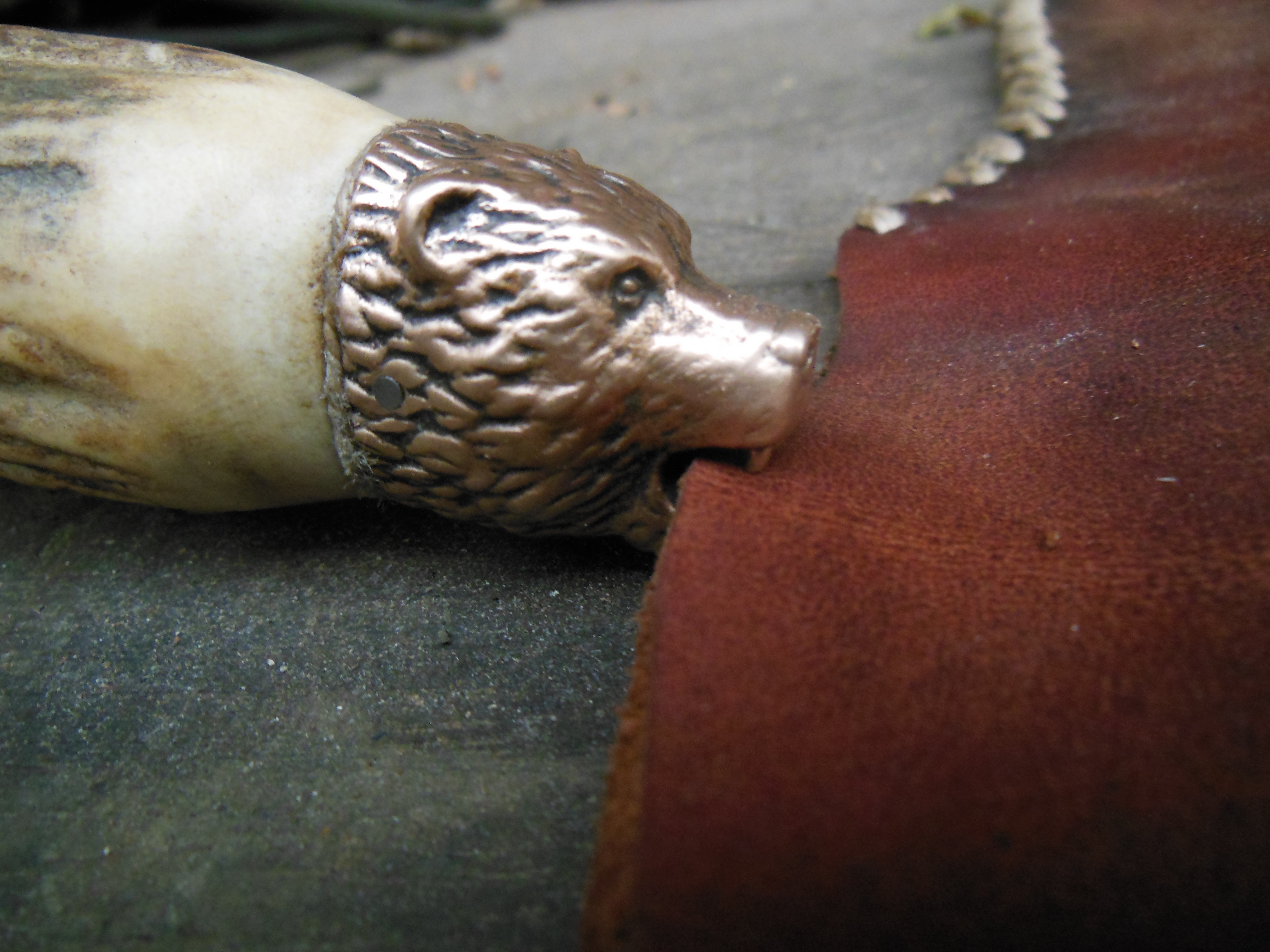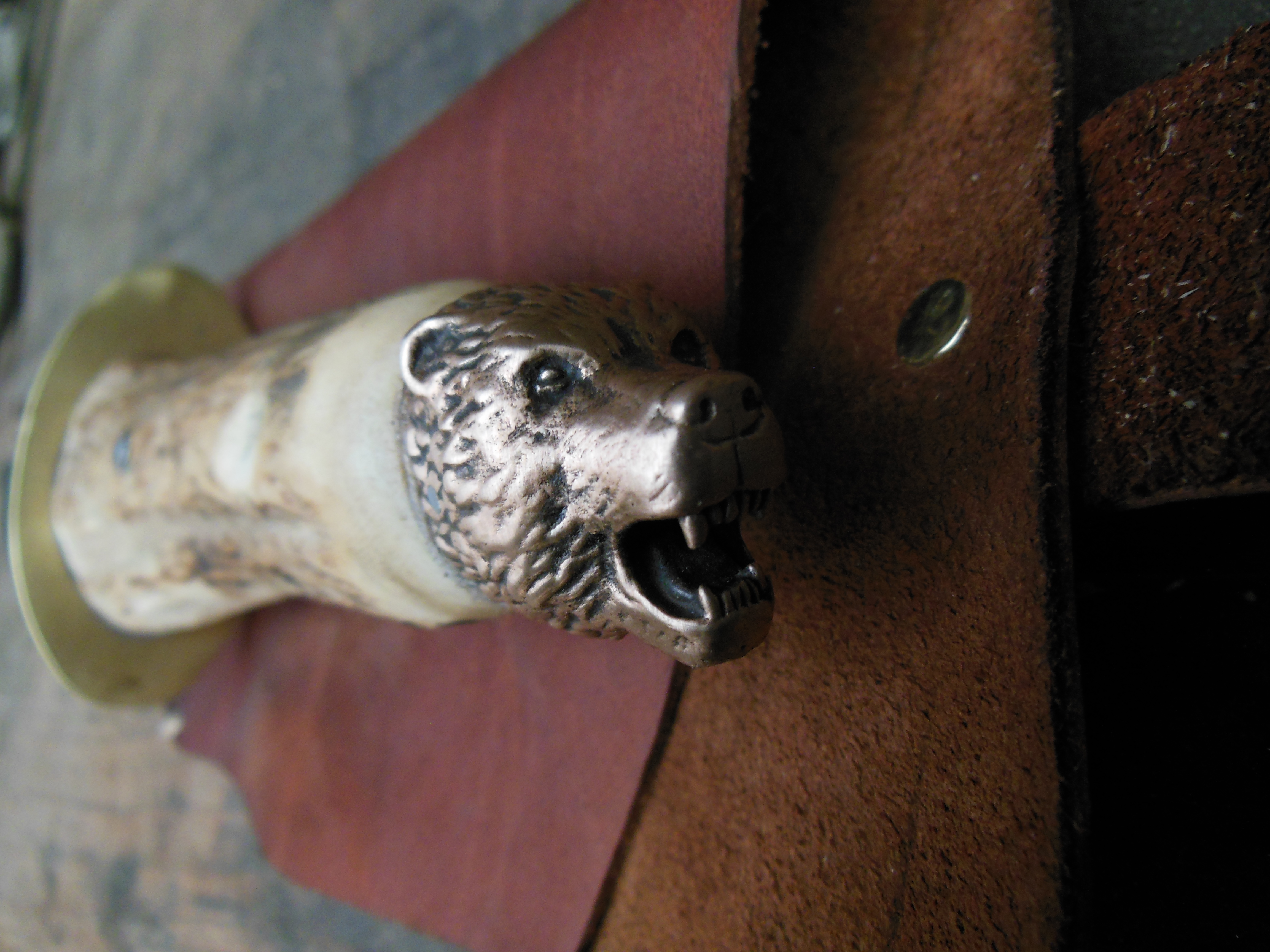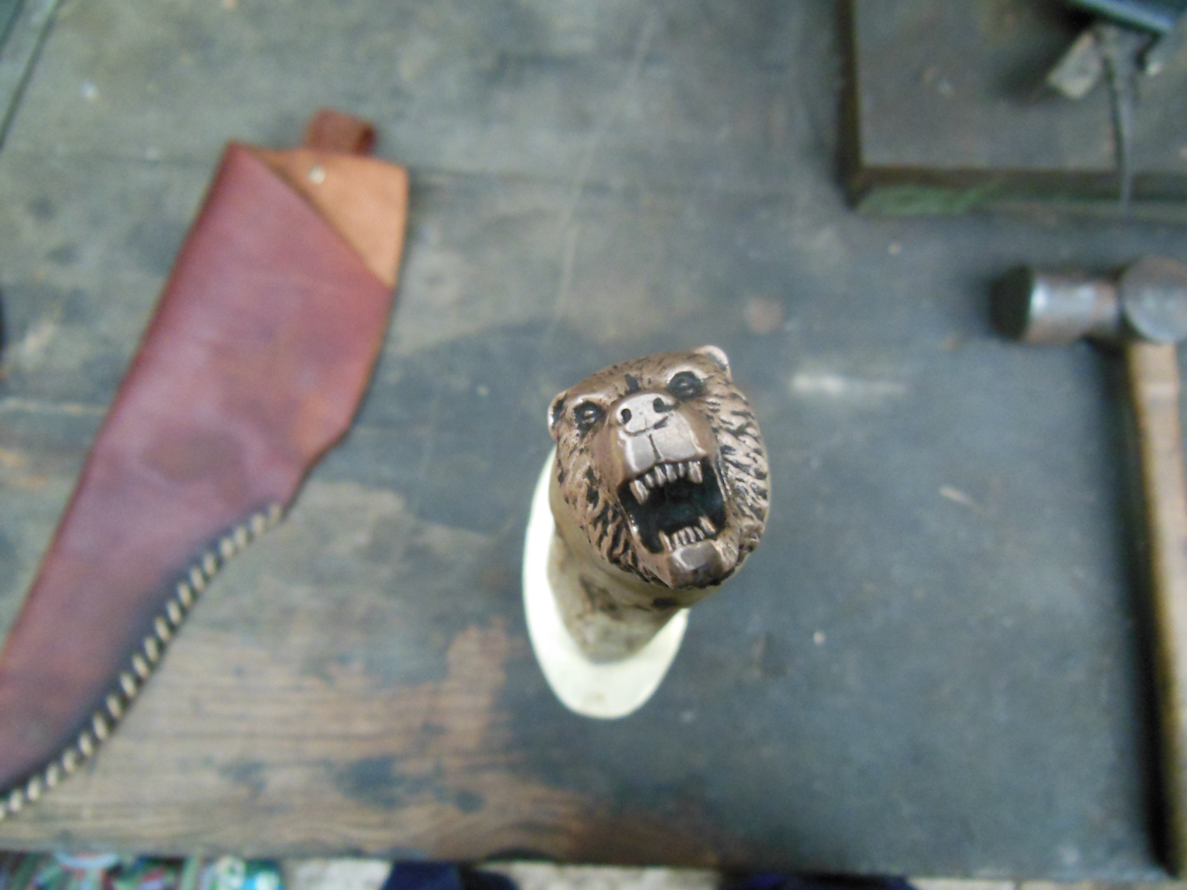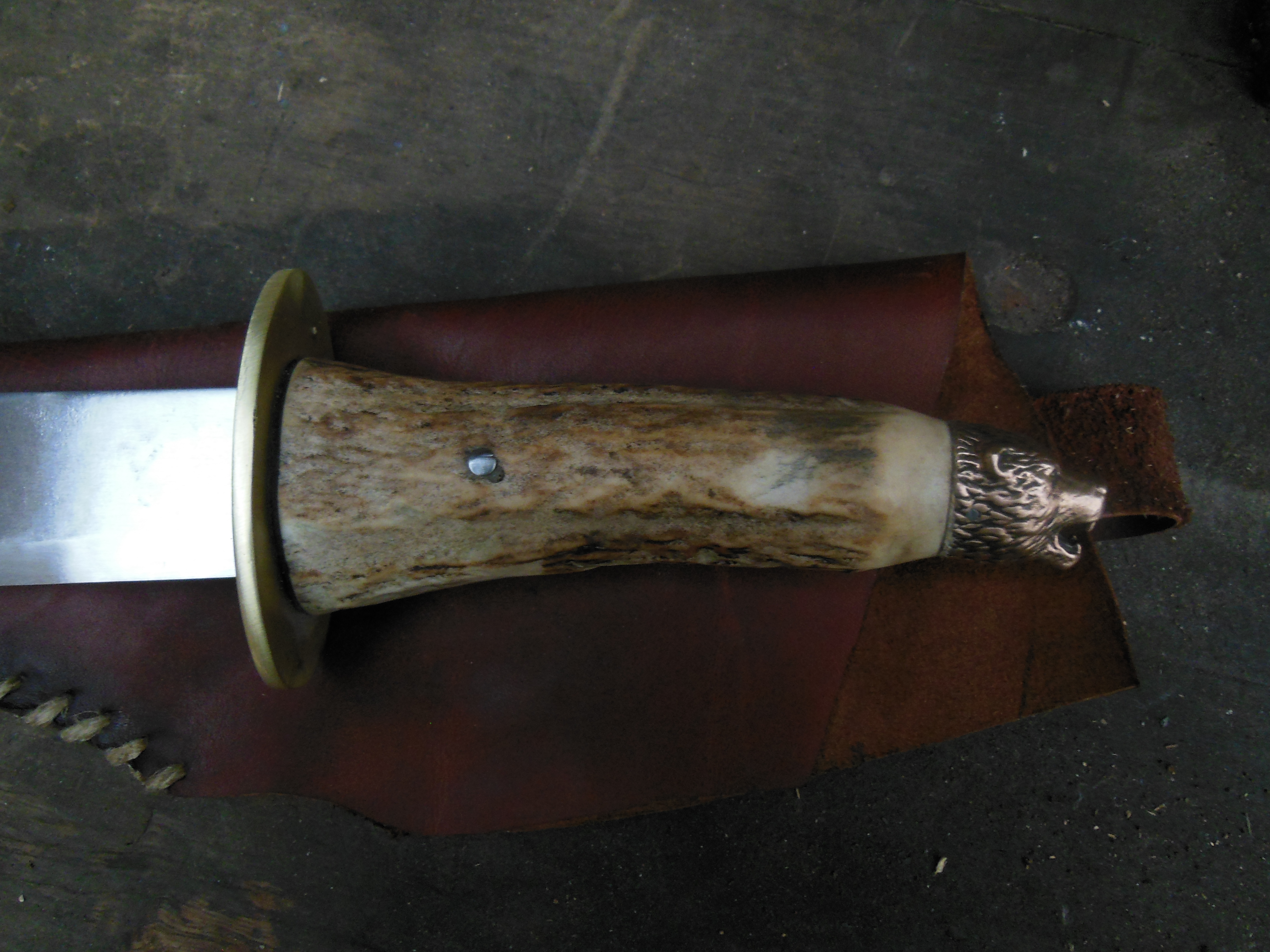 Couteau réalisé sur mesure pour mon pizzaiolo préféré. Lame de 21cm - Acier XC90 - manche de 13cm - Epaisseur 3.5mm au dos - Pommeau "Ours" en bronze moulé - manche en élan - garde en laiton.