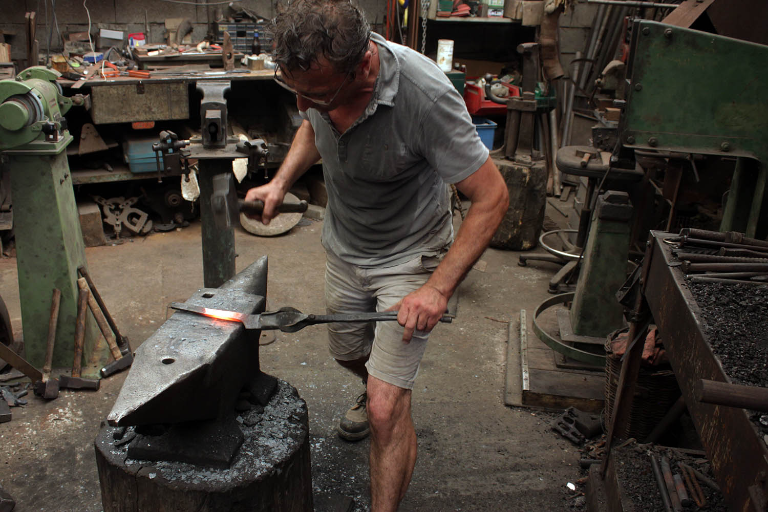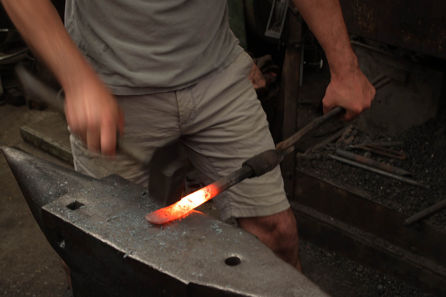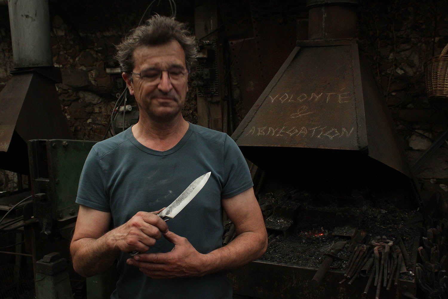Arisan compétent et passionné, Jerome s'est forgé ce superbe brut de forge à la maison. Un beau défi pour maintenir la cohérence des lignes de ce couteau forgé pleine masse.