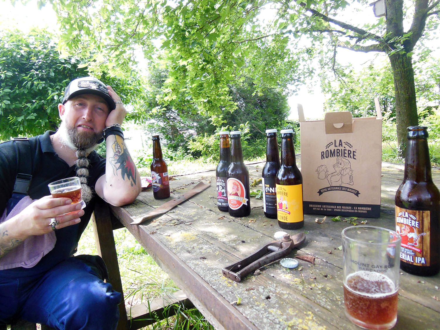 A la forge, j'ai eu le plaisir de recevoir Hervé, un grand balaise plein de tatouage et de poil, un grand spécialiste de la métallerie et de la forge industrielle. Pour lui c'était une grande première de travailler le marteau à la main, et ce fut parfait. D'après ses dires, il m'a même dit, avoir rarement été autant épuisé tellement il avait tout donné. Faut dire qu'il n'a pas chomé, ni sur le couteau, ni sur la mega fourchette qui va avec !!!