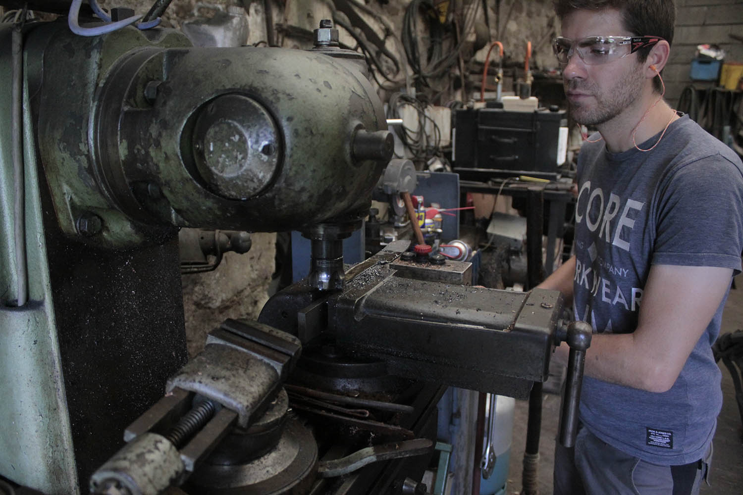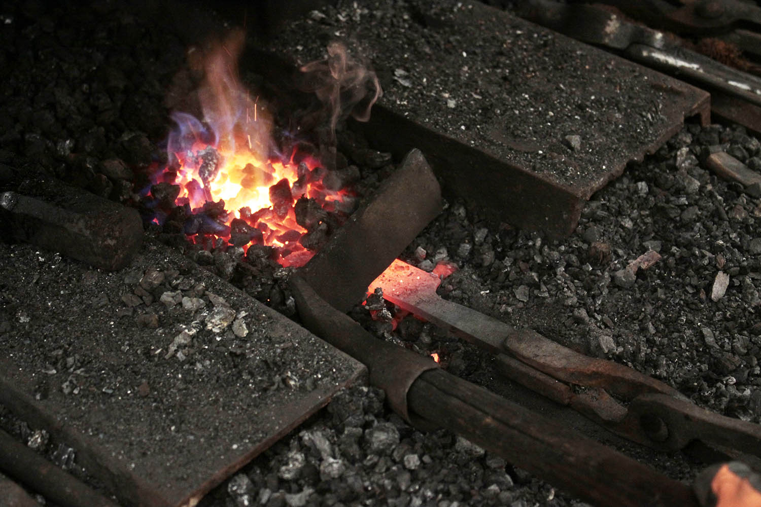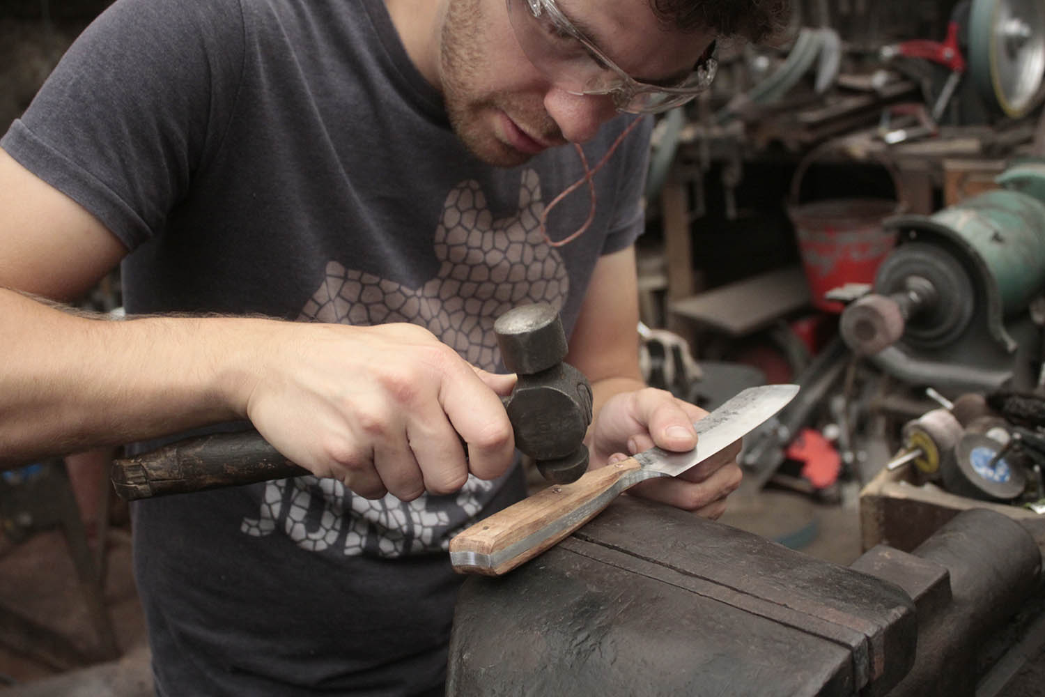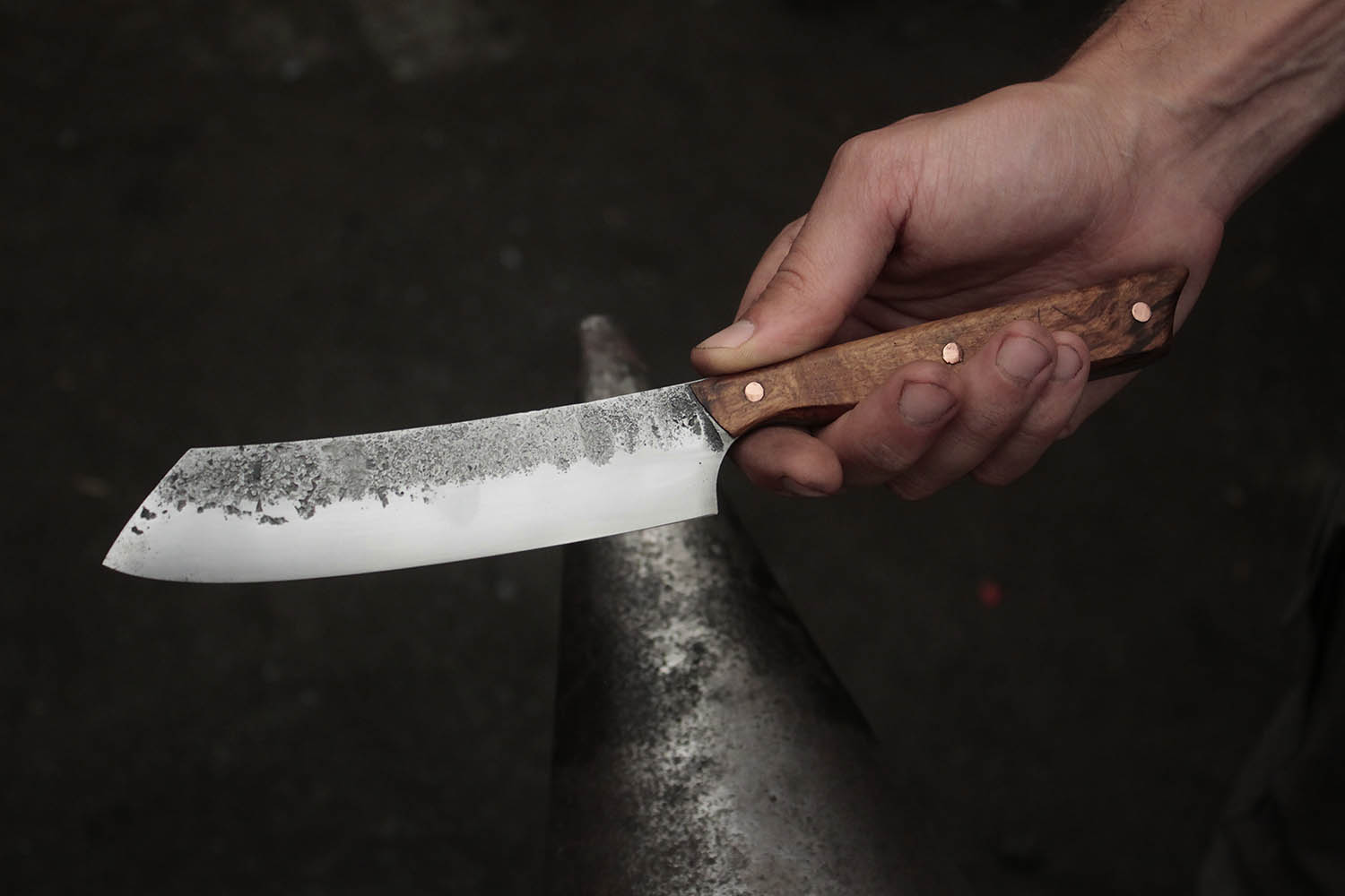 Manche en pommier et rivet en cuivre pour ce couteau d'inspiration Bunka