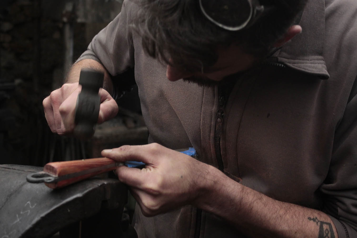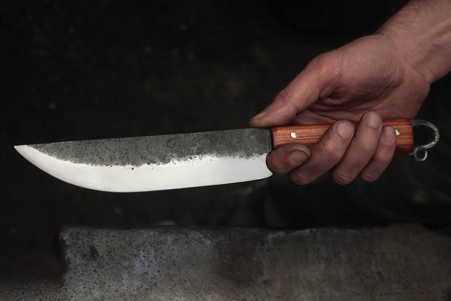 Manche en bois de rose, rivets laitons, et lame terriblement efficace. tout ce qu'il faut pour un bon stage de forge.